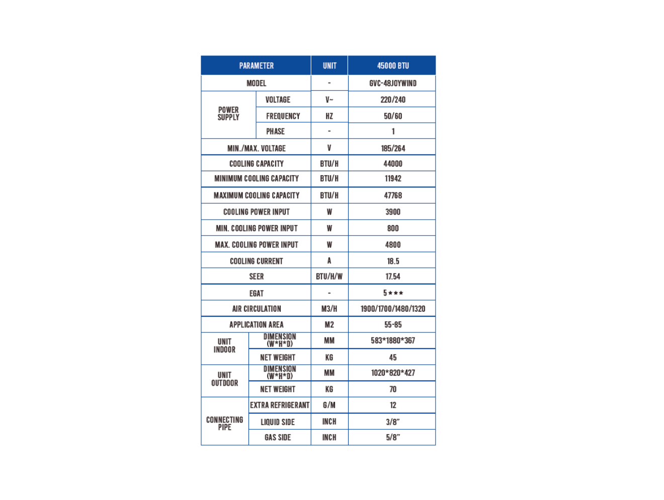 Gree JOY WIND ถูกออกแบบมาเพื่อมอบความเย็นที่แรง กระจายลมได้กว้าง และเย็นทั่วถึงอย่างรวดเร็ว ด้วยระบบ Dual Blower ขนาดใหญ่ด้านบนและด้านล่าง ที่ได้แรงบันดาลใจจากกังหันเครื่องบิน โดยมีเส้นผ่านศูนย์กลาง 40 ซม. ทั้งสองจุด ช่วยส่งลมได้สม่ำเสมอและมีประสิทธิภาพ พร้อมปริมาณลมสูงสุดถึง 2050 m³/h ให้ความเย็นกระจายเร็วทั่วทั้งห้อง ช่องลมด้านบน ออกแบบให้บังคับทิศทางลมได้ดี ส่งลมไกลได้ถึง 9 เมตร ขณะที่ ช่องลมด้านล่างสามารถเปิด–ปิดแยกได้ เพื่อเลือกความแรงลมหรือความสบายตามต้องการ และช่วยกระจายลมครอบคลุมพื้นที่ทั้งห้องแบบรอบทิศทาง อีกทั้งยังดูแลรักษาง่ายด้วยดีไซน์ที่ ถอดทำความสะอาดได้เพียง 2 ขั้นตอน ทั้งตะแกรงช่องลมและแผ่นกรองอากาศด้านข้างที่ถอดออกได้สะดวก ช่วยให้ทำความสะอาดได้รวดเร็วและมีประสิทธิภาพ โดย JOY WIND มีให้เลือก 1 รุ่น ที่ขนาด 45,000 BTU เหมาะสำหรับพื้นที่ขนาดใหญ่ที่ต้องการความเย็นแรงและสม่ำเสมอในทุกวัน