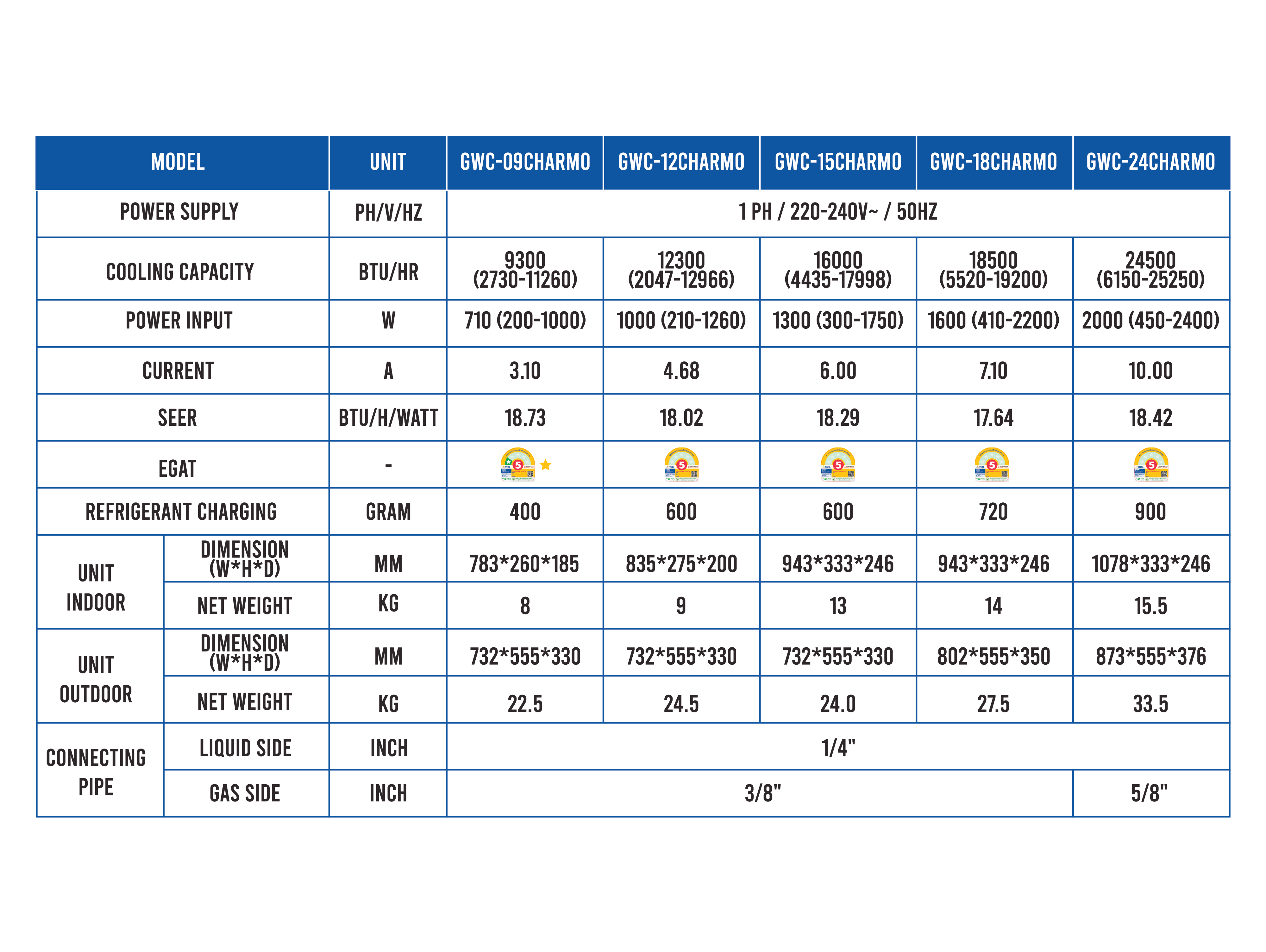 Gree CHARMO Series คือเครื่องปรับอากาศอินเวอร์เตอร์ประสิทธิภาพสูงที่ออกแบบมาเพื่อมอบความเย็นสบายอย่างมั่นคง ประหยัดพลังงาน และใช้งานได้ทนทานในระยะยาว ด้วยเทคโนโลยี Inverter ช่วยรักษาอุณหภูมิให้คงที่ ลดการกินไฟ พร้อมใช้น้ำยา R32 ที่เป็นมิตรต่อสิ่งแวดล้อม CHARMO Series มีให้เลือกทั้งหมด 5 รุ่น ครอบคลุมขนาดตั้งแต่ 9,300/12,300/16,000/18,500/24,500 BTU ตอบโจทย์ได้ตั้งแต่ห้องเล็กไปจนถึงห้องขนาดใหญ่ มาพร้อมฟังก์ชันที่ช่วยเพิ่มความสบายและความคุ้มค่า เช่น Fast Cooling และ Turbo Mode ช่วยเร่งความเย็นได้รวดเร็วทันใจ, I-FEEL ช่วยวัดอุณหภูมิบริเวณตัวผู้ใช้งานเพื่อปรับความเย็นให้แม่นยำยิ่งขึ้น, Energy Saving ช่วยลดการใช้พลังงานในชีวิตประจำวัน และ LED Display ที่ช่วยให้ดูสถานะการทำงานได้ชัดเจน พร้อม Timer ตั้งเวลาเปิด–ปิดเพื่อความสะดวกและช่วยประหยัดไฟ อีกทั้งยังดูแลความสะอาดและคุณภาพอากาศด้วย Health Filter ช่วยกรองอากาศให้สะอาดขึ้น และ Intelligent Cleaning ช่วยลดการสะสมของสิ่งสกปรกภายในเครื่อง เสริมความทนทานด้วย Blue Fin & Gold Fin และ Advanced Corrosion Protection ช่วยป้องกันความชื้นและการกัดกร่อน เหมาะกับสภาพอากาศร้อนชื้น พร้อม X-Fan ช่วยเป่าลมไล่ความชื้นหลังปิดเครื่องเพื่อลดกลิ่นอับ และเพิ่มความมั่นใจในการใช้งานด้วย Wide Voltage Range และ Power Drop ที่ช่วยให้เครื่องทำงานได้เสถียรแม้แรงดันไฟไม่นิ่ง รวมถึงระบบ 4 Protection เพื่อความปลอดภัยของการใช้งาน และ DIY Filter ที่ช่วยให้ดูแลรักษาได้ง่ายยิ่งขึ้น