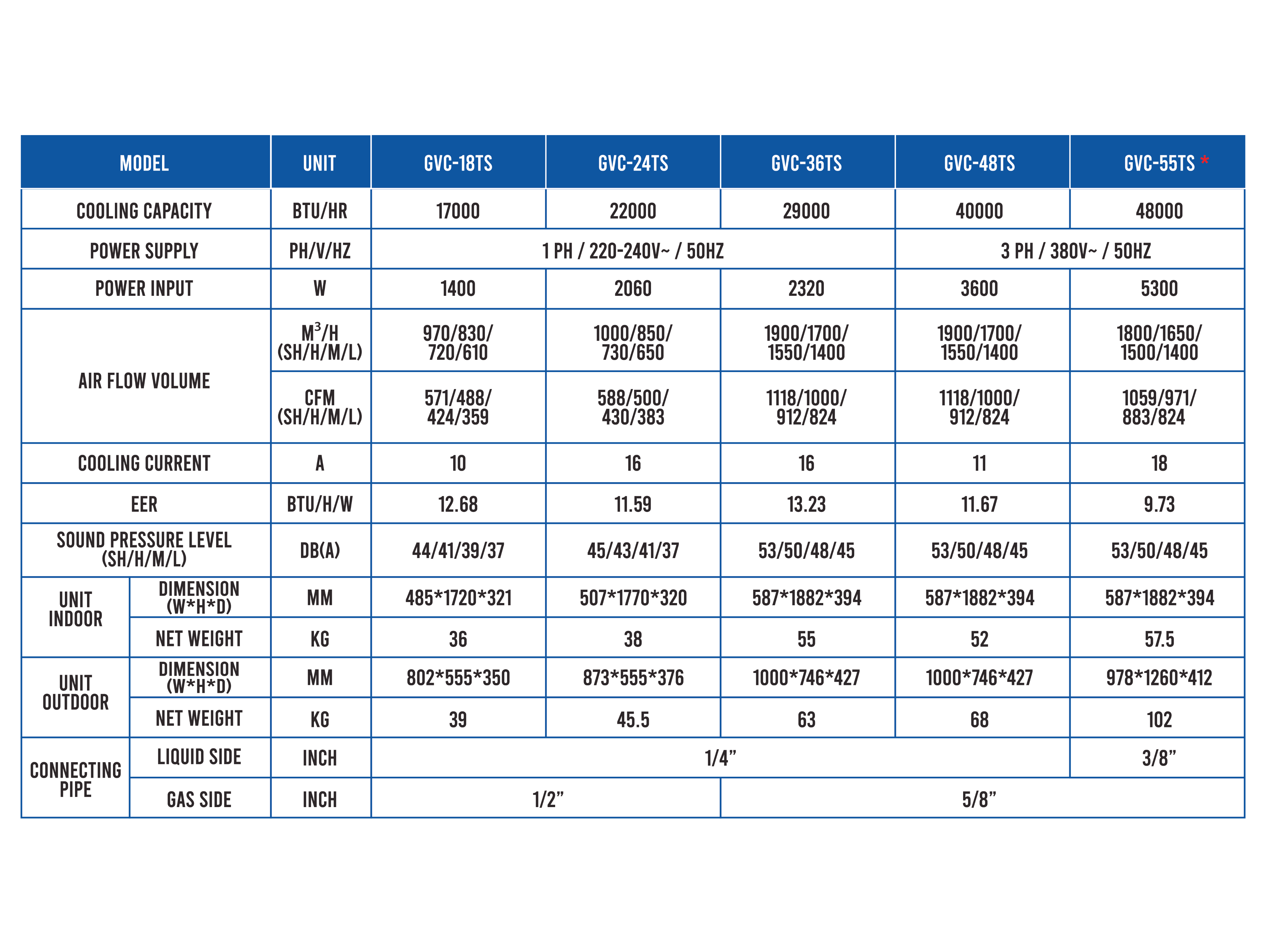 Gree TS Floor Standing Series คือเครื่องปรับอากาศแบบตั้งพื้นประสิทธิภาพสูงที่ออกแบบมาเพื่อรองรับการทำความเย็นในพื้นที่ขนาดใหญ่ เช่น ห้องนั่งเล่นขนาดใหญ่ ล็อบบี้โรงแรม ร้านอาหาร ออฟฟิศ หรือพื้นที่เชิงพาณิชย์แบบเปิด โดยมีให้เลือกทั้งหมด 5 รุ่น ครอบคลุมขนาดตั้งแต่ 17,000/22,000/29,000/40,000/48,800 BTU ช่วยให้เลือกได้เหมาะกับขนาดพื้นที่และความต้องการใช้งานจริง มาพร้อมฟังก์ชัน Wi-Fi ช่วยสั่งงานได้สะดวกจากระยะไกล และ Powerful Airflow ที่ช่วยส่งลมแรง กระจายความเย็นได้รวดเร็วทั่วพื้นที่ พร้อม 3D Airflow ช่วยกระจายลมได้รอบทิศทางให้เย็นทั่วถึงมากขึ้น เพื่อความสบายที่แม่นยำ I-FEEL จะช่วยตรวจจับอุณหภูมิบริเวณตัวผู้ใช้งานให้ปรับความเย็นได้เหมาะสมยิ่งขึ้น และ Health Filter ช่วยกรองอากาศให้สะอาดขึ้นในทุกวัน เพิ่มความสะดวกด้วย Turbo Mode ที่เร่งความเย็นทันใจ และ Timer สำหรับตั้งเวลาเปิด-ปิดเพื่อการใช้งานที่คุ้มค่า พร้อมความเสถียรด้วย Wide Voltage Range ที่ช่วยให้เครื่องทำงานได้แม้แรงดันไฟไม่นิ่ง เสริมความมั่นใจด้วย Self Diagnosis ช่วยตรวจสอบความผิดปกติได้รวดเร็ว, Automatic Restart ช่วยกลับมาทำงานอัตโนมัติหลังไฟดับ, และ Child Lock เพื่อความปลอดภัยในการใช้งาน อีกทั้งยังมีระบบ Fire Protection และ 4 Protections เพื่อเพิ่มการป้องกันตัวเครื่อง พร้อม Noise Reduction ที่ช่วยลดเสียงรบกวนให้ใช้งานได้สบายยิ่งขึ้น ด้านความทนทาน TS Series มาพร้อม Strong Outdoor Unit, ระบบ Anti-Vibration, Advanced Anti-Corrosion และ Upgraded Compressor เพื่อการทำงานที่มั่นคงและอายุการใช้งานยาวนาน พร้อมมาตรฐาน Environmentally Friendly และ Triple Certification เพื่อความมั่นใจในคุณภาพมากยิ่งขึ้น