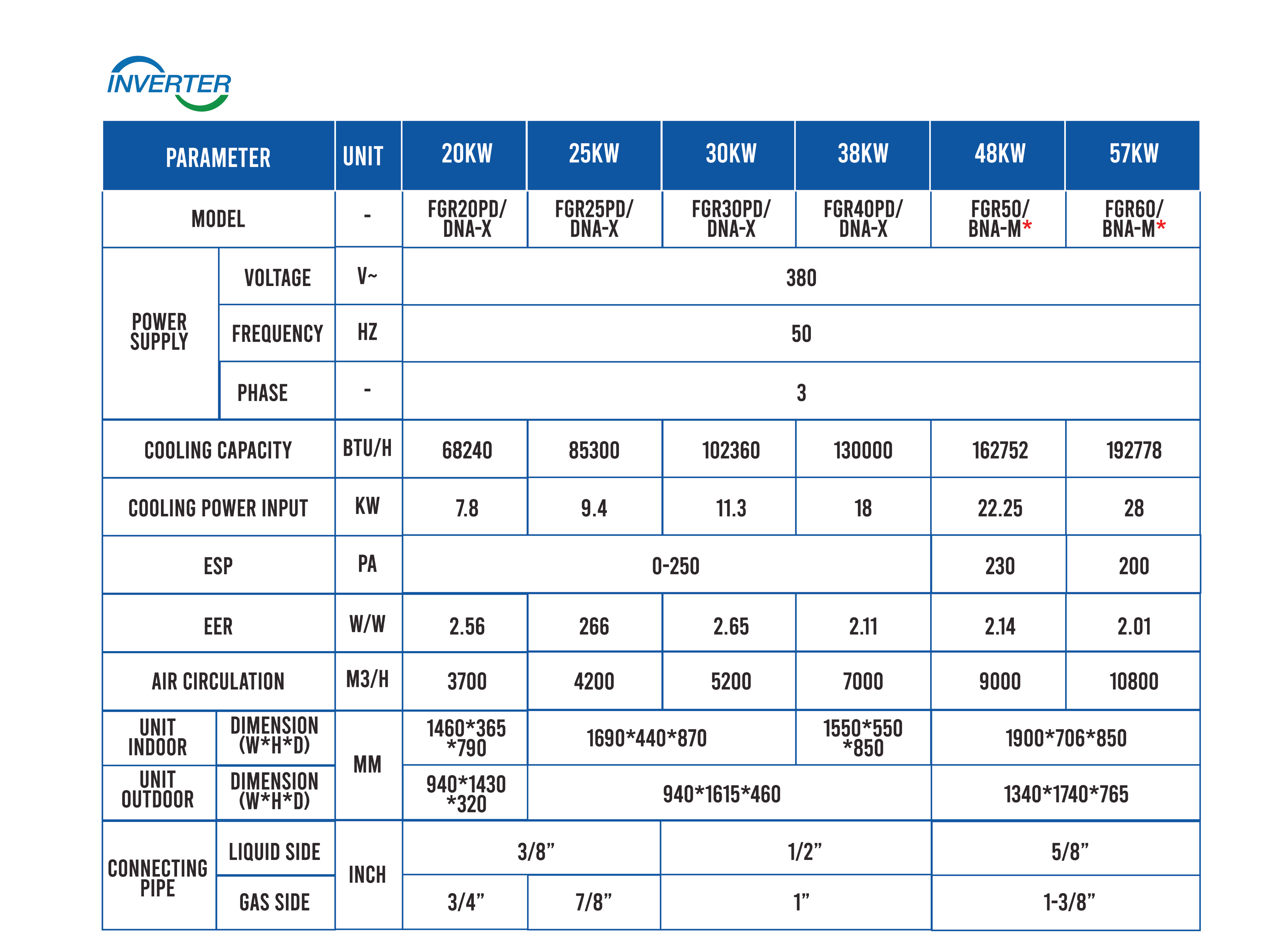 Gree Big Duct Inverter Series คือเครื่องปรับอากาศแบบดักท์ประสิทธิภาพสูงที่ออกแบบมาเพื่อรองรับงานติดตั้งที่ต้องการ แรงดันลมสูง (High External Static Pressure – ESP) และการกระจายลมที่สม่ำเสมอ เหมาะสำหรับพื้นที่ขนาดใหญ่และงานระบบที่ต้องการความยืดหยุ่นในการเดินท่อลม มาพร้อมเทคโนโลยี Inverter ช่วยให้การทำงานเสถียรและประหยัดพลังงานมากขึ้น พร้อมใช้น้ำยา R410A โดยมีให้เลือกทั้งหมด 6 รุ่น ครอบคลุมกำลังความเย็นตั้งแต่ 20/25/30/38/48/57 kW รองรับการใช้งานได้หลากหลายทั้งโครงการที่อยู่อาศัยขนาดใหญ่ อาคารพาณิชย์ และงานอุตสาหกรรมเบา เพื่อความสะดวกในการดูแลรักษา มาพร้อมฟังก์ชัน Easy Maintenance ช่วยให้บำรุงรักษาได้ง่าย, High ESP ช่วยรองรับการเดินท่อลมได้ดี, และ Wide Voltage Startup ช่วยให้เครื่องทำงานได้เสถียรแม้แรงดันไฟไม่นิ่ง พร้อม Self Diagnosis ช่วยตรวจสอบความผิดปกติได้รวดเร็ว, Quality Motor ช่วยให้ลมแรงและทำงานได้ต่อเนื่องอย่างมั่นใจ รวมถึง Strong Outdoor Unit ที่ทนทานต่อสภาพแวดล้อม พร้อมความสามารถในการ ทำงานได้ในอุณหภูมิสุดขั้ว และระบบ Comprehensive Protection เพื่อเพิ่มความปลอดภัยและยืดอายุการใช้งานในระยะยาว